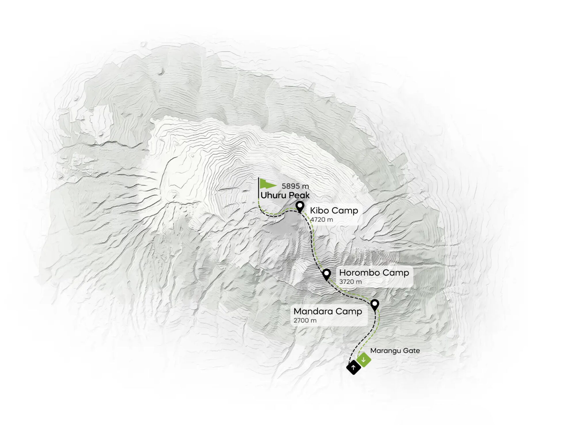 The Marangu Route, also known as the Tourist or Coca-Cola Route, is the most popular, least difficult, and shortest path to Uhuru Peak on Mount Kilimanjaro. Around 70% of climbers choose this route for its relatively gentle gradients.